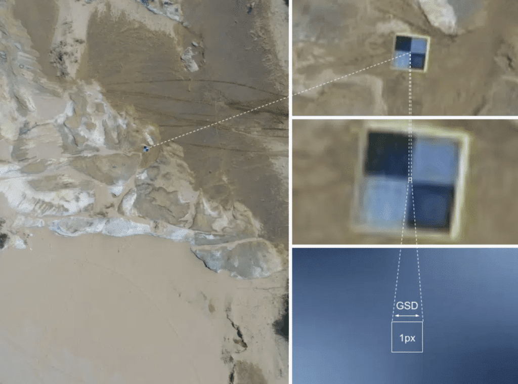 - A GSD of 3cm means each pixel represents 3cm on the ground (3×3 = 9 square centimetres).